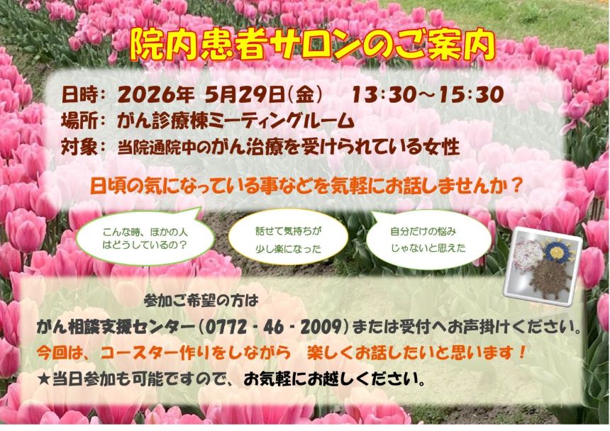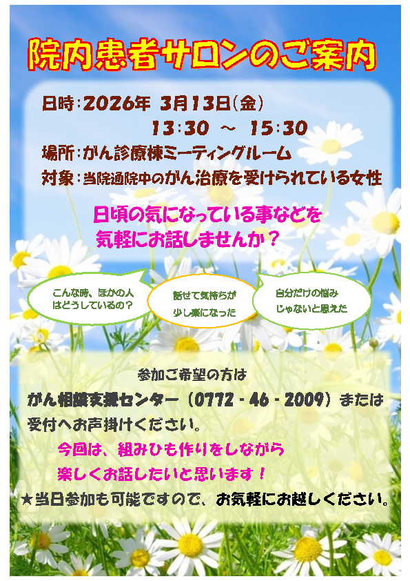 当院ではがん患者さんやご家族の方が集まり、つらさや悩みについて語り合うサロンを開催しています。詳しくはがん相談支援センターへお問い合わせください。